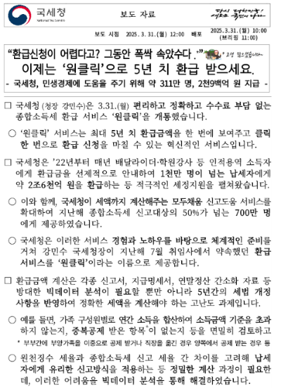 반면, ‘원클릭’ 서비스는 한 번의 신청만으로 최근 5년 치의 종합소득세 환급금을 자동으로 정산하여 지급하는 시스템입니다.