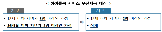 최근 정부는 아이돌봄 서비스의 우선 제공 대상을 기존보다 확대하여 '12세 이하 2자녀 이상' 가구도 포함하기로 발표하였습니다.
