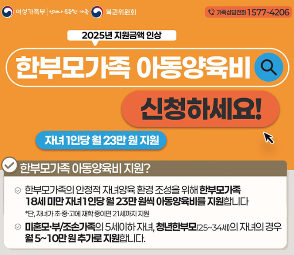 2025년부터 정부는 한부모가족의 아동양육 환경을 개선하고, 자녀의 건강한 성장을 돕기 위해 자녀양육비 지원 제도를 한층 강화하였습니다.