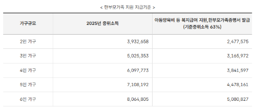 가구의 소득이 기준 중위소득 63% 이하인지 (2025년 기준 3인 가구 약 316만 원 이하)