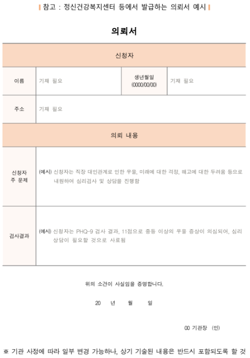 이 의뢰서는 신청일 기준 3개월 이내 발급된 것이어야 하며, 유효기간 내 제출해야만 심리상담 바우처 신청이 가능합니다.